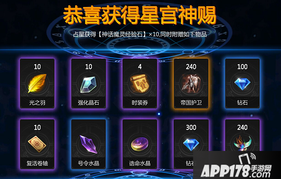 2、钻石占星:土豪高富帅们的不二选择,200钻石一次的占星虽然价格不菲,但是获得的装备和道具绝对是物超所值的!神话魔灵经验石(必得),珍贵的羽翼培养材料,象征着贵族荣耀的时装券,稀有的三星魔灵,还有各种各样的珍贵道具都能通过钻石占星获得。在这里着重说一下魔灵的重要性,因为存在着缘分系统,所以只有收集更多的魔灵才能有机会激活给力的缘分,大幅提升战斗力。然而三星魔灵合成需要300灵魂石,一点点刷副本的话需要极大的工作量,这也体现出了钻石占星的价值!建议有能力的玩家都在游戏早期进行1-2次的钻石十连,以便在前期就取得优势!