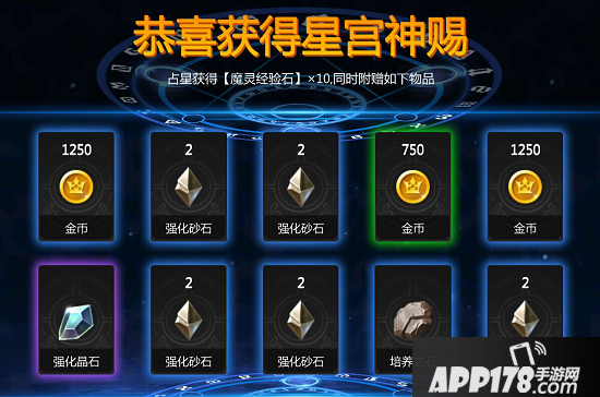 1、金币占星:必得魔灵经验石,随机获得的道具包括金币、培养之石、强化砂石等装备强化和锻造材料,坐骑培养和进阶材料,还有几率开出一星魔灵。因为金币开出的物品都是消耗品,所以在前期升级较快,装备和坐骑强化培养需求较高的时候,金币十连的性价比非常高,即使不是消耗品,也会以金币的形式收回成本,可以说是稳赚不赔。不过由于游戏初期升级技能也需要消耗数量不菲的金币,所以之间的平衡还需要大家自己斟酌啦~
