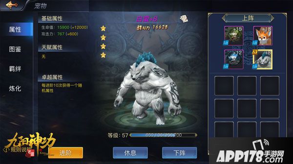 在《九阳神功:起源》中,好的宠物拥有超强属性加成,是提升战力的最佳选择。低星级的宠物可以在副本中轻松获得,高品质宠物就需要在福地探宝中抽取了。如果你玩游戏从来都是非洲血统,建议你把日常没用的装备挂在拍卖行卖掉,再用攒下来的钱从其他玩家手中收一只好的宠物。宠物可以进阶和升级,升级需要经验,进阶需要宠物丹。另外,侠客们要注意宠物之间羁绊的存在。当满足羁绊条件时,玩家能获得额外属性加成。