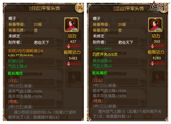 归云套装的效果可以减少怒招冷却时长,比较适用于怒招威力大的武学套路。