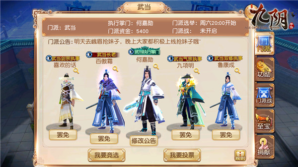 在12月即将到来的“一代宗师”版本中现有的五大门派将开启门派职位系统,所有本门玩家可以通过竞争来获得门派代掌门职位,在成为门派代掌门后方能开启门派战。与此同时,作为一门之主,掌握着门派生杀予夺大权,不但可以进行门派战宣战,还可以任命和罢黜长老,同时门派唯一的专属称号和门派战的特殊奖励等海量福利都是玩家争先竟逐的焦点。掌门之位每周重新轮换一次,本门战力前十可以竞选掌门,拥有逐鹿武林,称霸世界的特权。