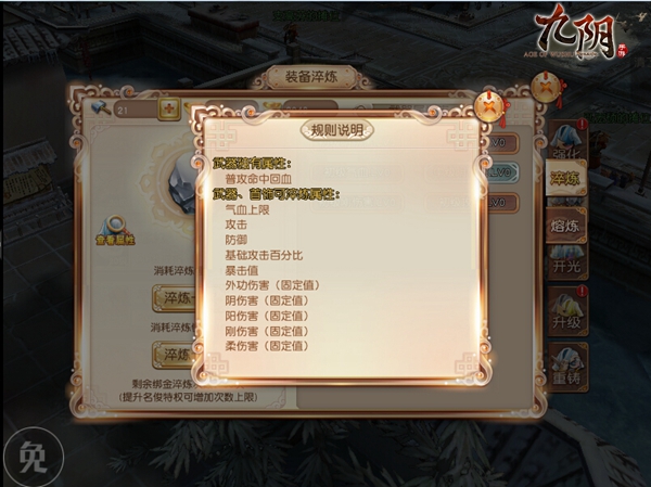 熔炼也是装备淬炼的重要一环。装备经过淬炼不一定会立即获得相适的属性,玩家在多次进行淬炼最后获得想要的属性后,会出现很多无用的属性。这些对玩家无用的属性可以通过熔炼来熔解,同时可以获得大量的陨魂,而陨魂正是提升淬炼后属性的关键材料。玩家只有先淬炼获取相适属性,再通过熔炼消解无用属性获得陨魂,方可快速对淬炼所获得的属性升级,让装备属性不断增强。