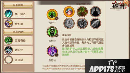 门派战和阵营战中平民和小R玩家可以选用冰心诀或混元功作为江湖内功,开启轰雷或者厚积薄发打输出,大r玩家用紫霞功开紫气东来心法恢复打持续战斗,副套路一般选择霓裳功或太极拳来恢复气血。