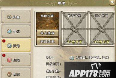 1、枫晚古道这一个玩法中玩家可以获得各种开光材料,这一个玩法只有在每周二、周六才会开放。这一个玩法是不消耗体力的,并且玩家只能够参加三次,玩家在其中躲避落石打破宝箱才能够获得收益。