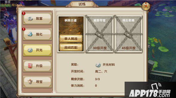 关于开光材料的来源问题,首先目前阶段能够参与战场、心魔、剧情扫荡等玩法的玩家较多,去玩家手中收材料是个不错的选择。江湖试炼是开光材料主题的时候参加一下为好,毕竟每周周二和周六参与活动能收获不少材料。