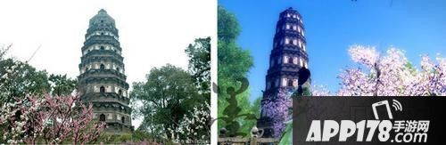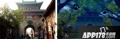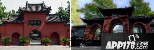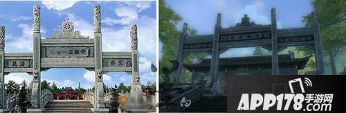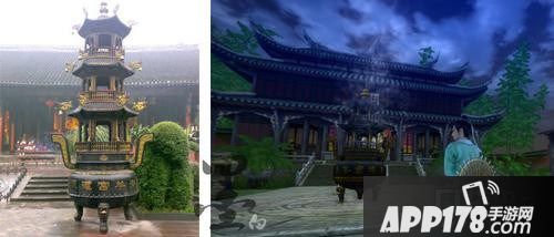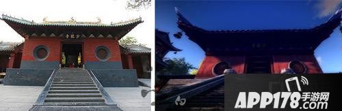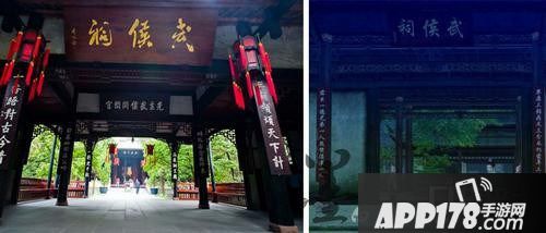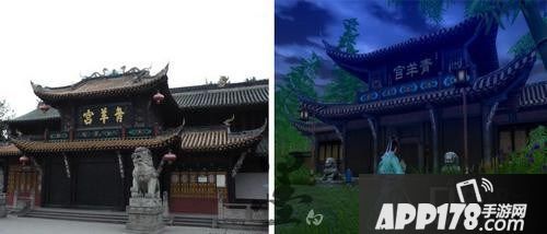 成都青羊宫,图左为实景,图右为游戏截图