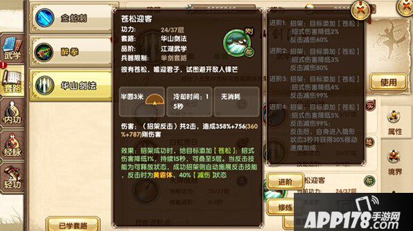 招架的进阶效果比较多,首先是降低敌人的招式伤害,同时反击过程能减伤,最高达99%,双重减伤基本上可以让玩家在反击过程中无伤。另外在进阶到四阶还有一个特殊的效果:隐身3秒+30%的移速。隐身在单P中作用也不大,一般反击成功都能直接打破对手的霸体,然后一顿连招5秒。但是也有例外,对面同样是华山的“白云出岫”的话,反击是打不中的,此时隐身状态就很有用了,可以静静地看清对手的下一步动作再动手,万无一失。在面对红霸体BOSS作用就很明显了,反击、减伤不说,隐身可以让玩家等技能CD、走位等等,干起BOSS来会相对容易点。有些玩家可能会想到奇葩一点的用法:靠着3秒隐身去夺书。哈哈,不保证不会被乱剑砍死哦!