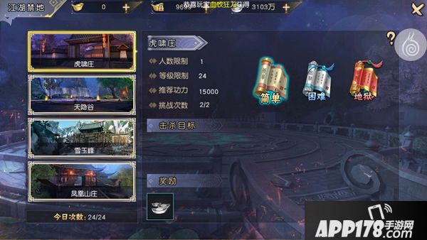 《九阴真经3D》江湖禁地虎啸庄是游戏最先开启的禁地玩法,该禁地开放等级为24级,进入人数上限为1人,通关奖励大量银子,是玩家获取大量银子的最佳途径。