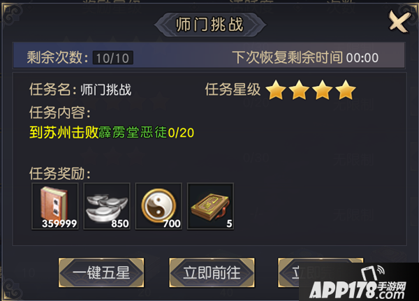 玩家等级达到15级后将会自动承接师门挑战任务。师门挑战任务默认储存上限为10次,次数不满时,每一小时恢复一次任务次数。玩家完成任务内容后,通过点击任务追踪调出师门挑战界面。在界面上可进行领取奖励、花费绑金立即完成、花费绑金一键五星、立即前往等功能。任务的奖励与任务的星级成正比,每个任务对应的星级为随机。