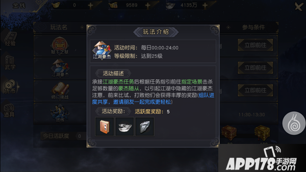 江湖豪杰玩法需要玩家达到25级方可体验,玩家接受任务后前往指定场景击杀足够数量的豪杰随从后,豪杰将会现身与玩家战斗,玩家击杀豪杰后即可获得江湖豪杰任务的丰厚奖励。江湖豪杰任务每天可以完成20次。