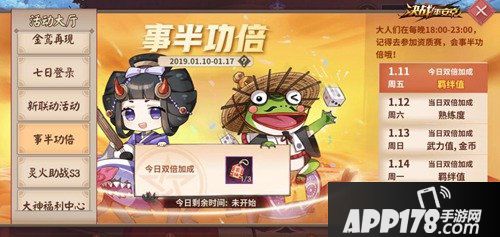 1月11日至1月17日活动期间,每晚18点到23点,各位阴阳师大人在线即可参与“事半功倍”活动,获取包括金币双倍、羁绊值双倍、武力值双倍(式神应援值)、式神熟练度双倍在内的双倍加成效果。大人们领取加成效果之后,在接下来进行的三场资质赛中,都将获得分别获得对应的双倍加成,同一天可最多拥有两种同时生效的加成效果。除了武力值双倍加成需要“战斗胜利”条件之外,其余加成效果无论输赢都可生效!