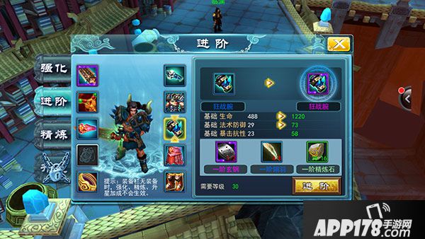 装备进阶在21级开放,其界面处于角色菜单的强化选项内,进阶之后可以大大提升装备的各项属性。说到装备进阶,就不得不先说一下装备的品质。游戏中装备分为五个级别,级别由低到高分别为白色、绿色、蓝色、紫色以及橙色。目前在游戏中只有特定的蓝装可以进阶到更高品质的装备,而戒指、坠饰等部位的装备不能进阶。