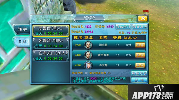 游戏的竞技活动目前分为牙兽台和亡命关口两种玩法。其中牙兽台分为单人和组队两种玩法。单人玩法是通过挑战排行榜上与自己排名相近的玩家,不断提升自己的排名;组队玩法是指玩家通过自己组队或随机组队的方式,参与队伍竞技匹配,固定时间内击杀敌方队伍全部玩家为胜。无论胜负玩家在牙兽台PK中都将获得荣誉值奖励,获胜玩家获得奖励较多。而亡命关口是一个20人混战PK战场,在一段时间内玩家们在战场上互相厮杀,倒计时结束后根据击杀情况给予不同的奖励。