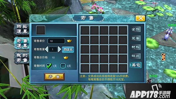 寄售界面也很简明,左边是物品的出售界面,在这里你可以选择物品的寄售单价、寄售数量、寄售时间等信息,右边展示出来的是你的商品列表,寄售时可以手动输入寄售单价,寄售物品卖出后将收取10%的交易税,小数点后余额将不会扣取哦~
