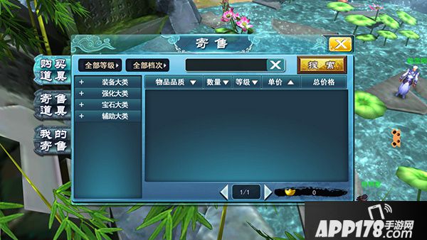 寄售系统中的购买界面比较明晰,左边是可交易物品的分类选项,具体有装备、强化、宝石、辅助四大类,每个大类点击后可展示详细分类。分类选项上方是物品筛选选项,可以对搜索物品的等级、档次的条件进行筛选。界面的正上方是一个搜索框,可以通过输入关键字来搜索物品,比如你想搜索鹤雪的装备,直接输入鹤雪,就能查询出相关装备。下面是展示的物品列表,分别展示出物品品质、数量、等级、单价、总价格等类别信息,这些类别信息可以通过点击来进行升序或降序排列。