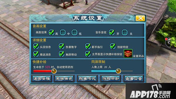 说到自动战斗系统,就不得不提一下在系统设置选项内的设置药品和快捷补给这两个辅助功能了。其中,设置药品是指玩家在药店购买完不高于自身等级的药品后,可以在快捷补给按钮内设置药品,同时玩家也可以选择是否在游戏中显示该按钮。药品设置完毕之后,在快捷补给选项内可以调整自动使用药品的血量阈值。为节省药物,一般在准备面对较弱的怪物时,可以将阈值调低,而面对较强的怪物时,可以将阈值调高。设定完这两个选项之后,玩家在自动战斗打怪的过程中就可以实现不同情况下的自动补给了。