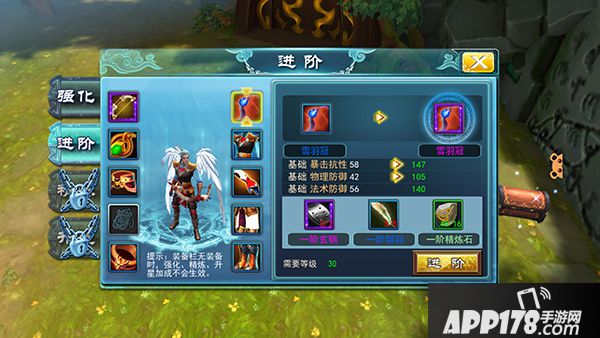 20级以上蓝色装备便可以进行装备进阶!装备进阶后可大幅提升装备的基础属性,也会提升装备的等级或品质。进阶材料可由剧情副本获得,也可以直接在荣誉商店购买。