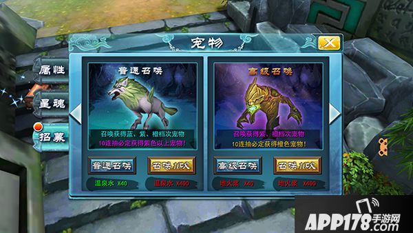 在宠物界面的招募栏内,玩家可使用温泉水、地火浆等道具随机招募相应档次的宠物,也可以使用神兽精神碎片来招募相应神兽。这些宠物招募材料的获取方式可以说是五花八门种类繁多,诸如在线奖励、幽林空地副本、亡命关口副本、帮派神兽任务等等活动都可以领取大量的宠物材料哦~