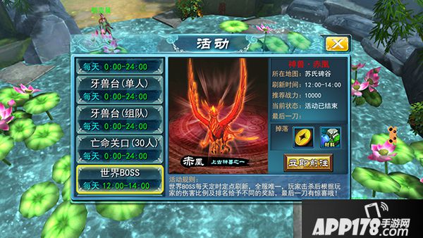 世界Boss活动每日12时至14时固定开放,在固定地点出现全服唯一一个世界Boss:神兽赤凰。到达该场景的玩家均可参与攻击神兽赤凰,世界BOSS死亡后,根据伤害类别的排名,发放伤害排名奖励,最后一刀完成神兽击杀的玩家会有惊喜奖励哦!