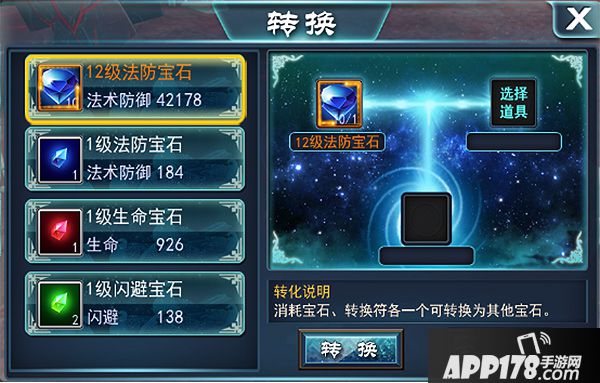 消耗宝石转换符,可将宝石转换为同级别的其他类型宝石,当你感觉目前的宝石不太给力的时候,不如试试换一种宝石吧~