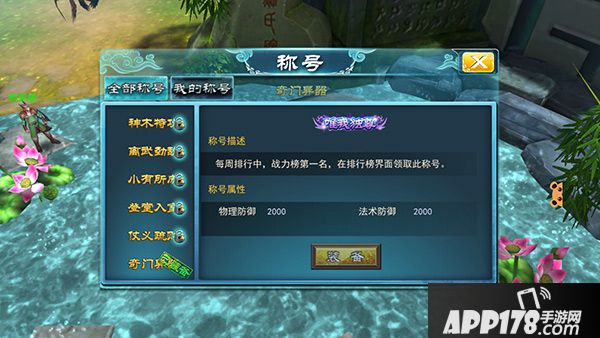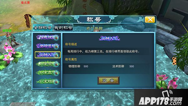 点开装备称号界面之后,就可以较为直观的查看称号的信息了。称号系统界面分为全部称号和我的称号两部分。全部称号栏里可以查看全部称号的获得方式和称号属性,同时已经获得的称号会显示已装备,未获得的称号会被一把小锁锁住且无法装备,各位收集控们要努力啦~我的称号栏里则是已收集称号的集合与汇总,操作起来也是十分的方便。