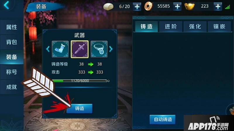 铸造模式,建议不要用元宝买升级材料,前期可以自己刷后面没材料大不了不升级,因为战力提的也不是很多。