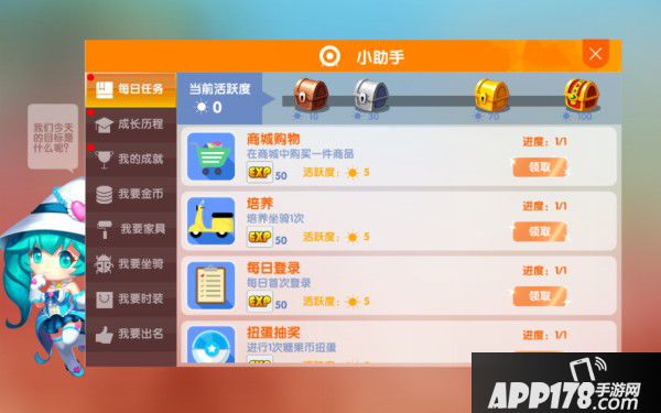 每日任务顾名思义,每天都会刷新。玩家完成每个单项任务能获得丰富的经验值和对应的活跃度。当活跃度满足档位需求后,还可以开启对应宝箱,内含大量金币和时装券、家具券的奖励。坚持每天完成任务,酷炫时装、豪华家具都不是梦。还不快快行动起来!