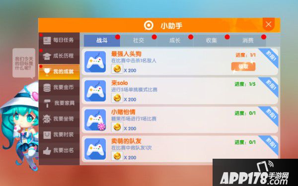 在《泡泡大乱斗》的成就系统中,主要分为战斗、社交、成长、收集和消费五大模块。每个模块下有着各自对应的具体任务,每个任务有多个阶段,丰富了用户的挑战,提高了挑战的难度。