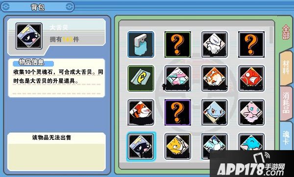 进入游戏主界面,点击下方的“背包”按钮即可进入,可查看已获得的道具、物品等。菜单栏分为全部、材料、消耗品、魂卡四种,可分别点击查看道具。直接点击道具可查看详细信息,还可在背包中直接出售。
