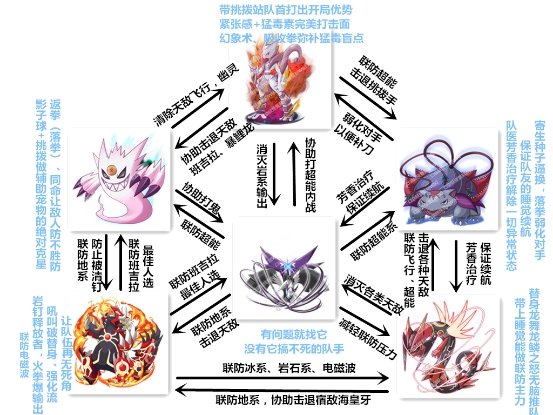 5.Mega妙蛙花的毒属性使它免疫猛毒素,同时能联防格斗,草属性免疫寄生种子、同时雷系伤害减半,是联防的一把好手最后就是终极神壕队伍的互助共生图了