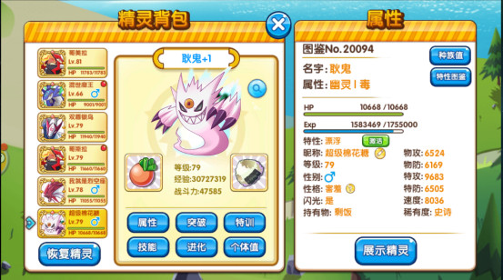 下面看看万能的白鬼!这个是我mega的第一只宠物,虽然不是极品但是也没那么操蛋,我配招影子球+十万伏特+催眠术+落拳,我想说的就是白鬼联防非常好而且落拳+催眠术这个东西恶心死别人这个就需要跟别人斗志斗勇。睡个2、3个宠物也是经常。