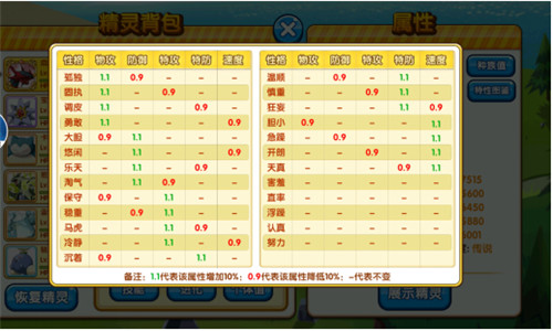 性格选择:新手可能都会问这个问题,对性格比较关心。实际上这个问题说简单也简单,大部分攻击宠物的最佳性格就是加速度,不减自己对应技能的攻击(特攻或是物攻)。其次是加自己对应技能的攻击(特攻或者物攻),不减速度。防御宠物选择加防不减速,就完全可以了。用着这条法则,然后直接点开宠物性格右边的问号看宠物属性性格表,或者手机里面收藏一个口袋妖怪复刻性格表,性格方面你完全不用纠结。