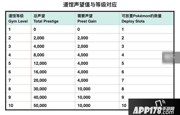 道馆在没有被占领的时候是白色的,被占领后,道馆颜色会变为占领道馆的玩家所属队伍的颜色,同时道馆上方会显示道馆内最强的一只Pokémon。道馆的声望值(Prestige)决定了道馆的等级,而道馆的等级决定了能放入的Pokémon的数量。在目前的游戏版本中,道馆等级最高为10级,道馆声望值与等级对应如下表: