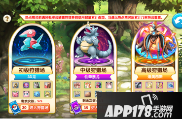 首先精灵园中最具特色的玩法莫过于每个猎兽场每日的热点精灵,热点精灵的挑战次数是有限的,不同等级的狩猎场每天的挑战次数也是不一样的。初级狩猎场每天共有5次的挑战机会,中级和高级狩猎场每天则只有3次狩猎的机会,如果想要加多次数则需要消耗钻石来购买狩猎场的挑战机会。