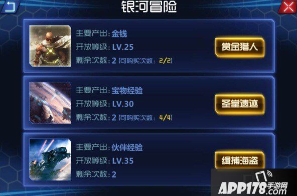 在银河冒险中主要产出银河币,伙伴经验和手环项链经验。随着等级提高会开启不同的挑战项: