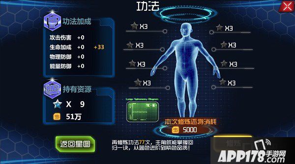 玩家通过剧情战斗可以获得星星,花费3颗星星以及相应的银河币可以修炼一次功法,功法可以提供玩家主角伤害,生命,防御方面的加成。功法修炼到一定阶段,可以使主角的品质提升由蓝色变为紫色。所以玩家需要不断的从剧情战斗获得更多的星星来修炼功法。