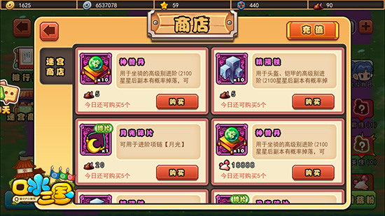 “黄金之乱”内还贴心地设置了迷宫商城,你购买行动力的时候会赠送浴血金沙、占领矿坑时获得的蘑菇粉都是商城兑换的重要货币。商城内出售的都是玩家不可或缺的重要物质,如进阶丹、灵兽丹、精铁、神铁等。