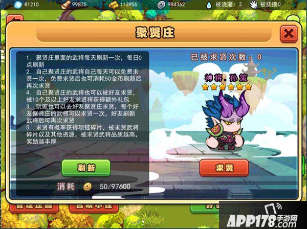 每天都会有贤士路过你的庄园,向他求贤就可以获得丰厚奖励。更有机会免费获得该武将的碎片哦!求贤的武将甚至包括神将哦!另外,不仅仅可以对自己庄园的武将求贤,同时也可以去别人的庄园求贤哦,一样有机会获得六星神将的碎片。接受过10次求贤的武将会离开,留下一个丰厚的大礼包给庄园主人。