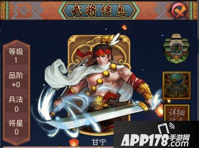 甘宁(?—222),字兴霸,东汉巴郡临江(重庆忠县)人。三国时期吴国大将。少年有力,读诸子,17岁左右任过蜀郡丞。与凌统有杀父之仇。公元204年率八百健儿依刘表,因居南阳,不见进用。公元205年转托黄祖,黄祖又以凡人畜之 。公元208年归吴见用于孙权,大有作为。破黄祖据楚关,攻曹仁取夷陵 ,镇益阳拒关羽,守西陵获朱光,击合肥退张辽,百骑袭曹营,孙权说:“孟德有张辽,孤有甘兴霸,足可敌矣”智勇双全,战功显赫。而在《全民战群英》中,甘宁的暴击能力比较强,下面来看看他的具体能力属性吧: