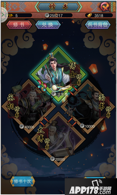 除了刷新奇宝楼和购买体力这些不可避免的元宝消耗,全部元宝都要忍住别花,在等级达到55级的时候,将开放修书功能,将全部元宝都用来修书,一本攻击金书的初始属性,就是加4000攻击,每次进阶都加,这远远比把元宝用去点将增加的战力更多,武将可以通过点将令来慢慢累积,但是元宝的产出是有限的,小R和非R将元宝存下来,用在修书上,才是一个比较好的开局。