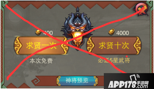 游戏前期通过推图和成就,很快就能筹齐4000元宝,而4000元宝就可以在点将台进行武将10连抽了,10连抽是有保底五星武将的,我想这时候很多主公都会忍不住去进行10连抽,来获取五星武将。但·····这是错误的选择!!!!!!!!!