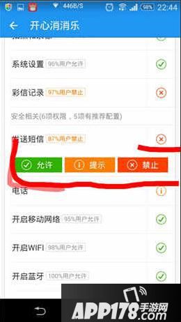 3、找到开心消消乐后,点击它,接着找到”发送短信的选项,选择禁止。
