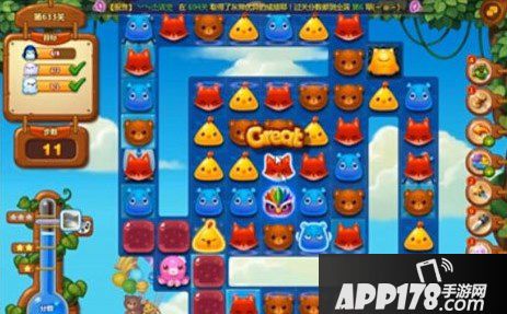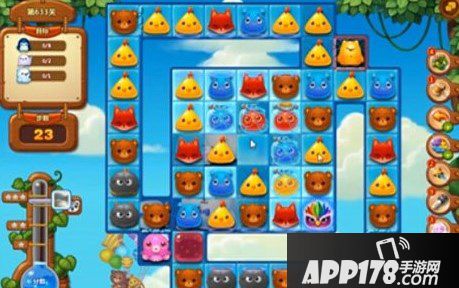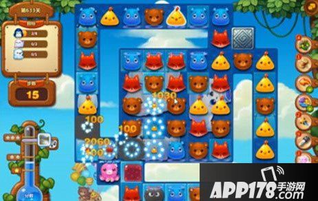 企鹅的位置是在周边的,消除起来只有通过直线特效。所以在中间的位置制作魔力鸟与直线特效的交换,然后在四周相同颜色动物比较多的时候,开始交换释放,这样就可以产生大量的消除效果,完成收集目标。