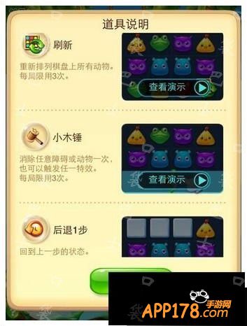 小木锤:消除任意障碍和动物一次,也可以触发任一特效,每局限制使用3次,如果能四连消或者特殊效果的时候用!