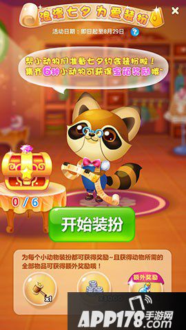 点击界面中的开始装扮按钮,就可以给小动物装扮了。当给他们转备好了七夕约会的装扮之后,还可以获得额外的奖励呢。