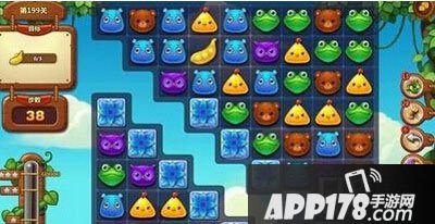 我们首先消除关卡出现的雪块,这样金豆荚就会下降。收集金豆荚的收集篮在关卡的左侧,所以我们让金豆荚下降在左侧的位置。然后进行消除。