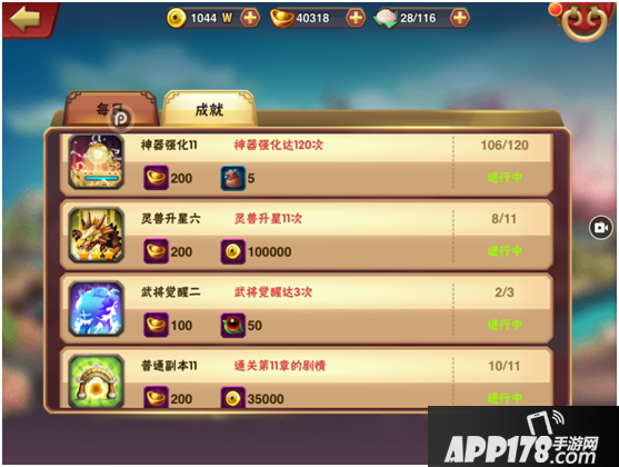 点击右上角的下拉角标,即可看见系统的入口!点开就会发现“每日任务”和“成就系统”,其中“每日任务”是每天重置,只要每天都完成指定内容,即可领取元宝奖励。而“成就系统”则是伴随主公成长的奖励体系,每完成一项成就即可领取一次任务奖励(每项成就只能完成1次)。