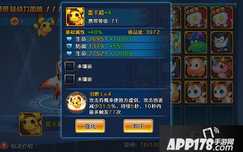 精灵技能引燃:攻击有概率使敌方虚弱,攻击增加伤害31.5% ,持续5秒 ,10秒 内最多触发1次 (持续时间由强化等级决定,强化越高持续越久)