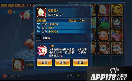 精灵技能引燃:攻击有概率使敌方虚弱,攻击伤害31.5% ,持续5秒 ,10秒 内最多触发1次 (持续时间由强化等级决定,强化越高持续越久)