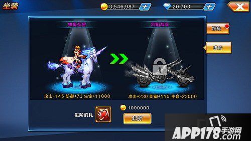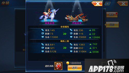 当我们开启坐骑系统后,默认获得的坐骑是路行鸭,每一阶进阶阶段分别是:路行鸭—独角圣兽—烈焰战车—C-H火箭。每次进阶不仅可以获得额外的属性,最酷的是还可以改变坐骑外形。